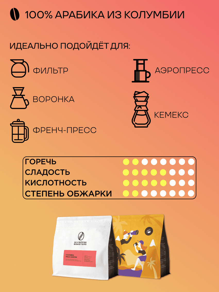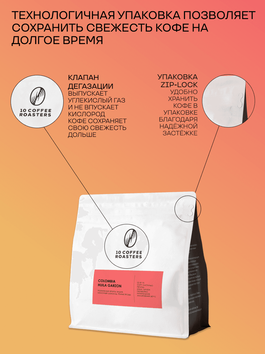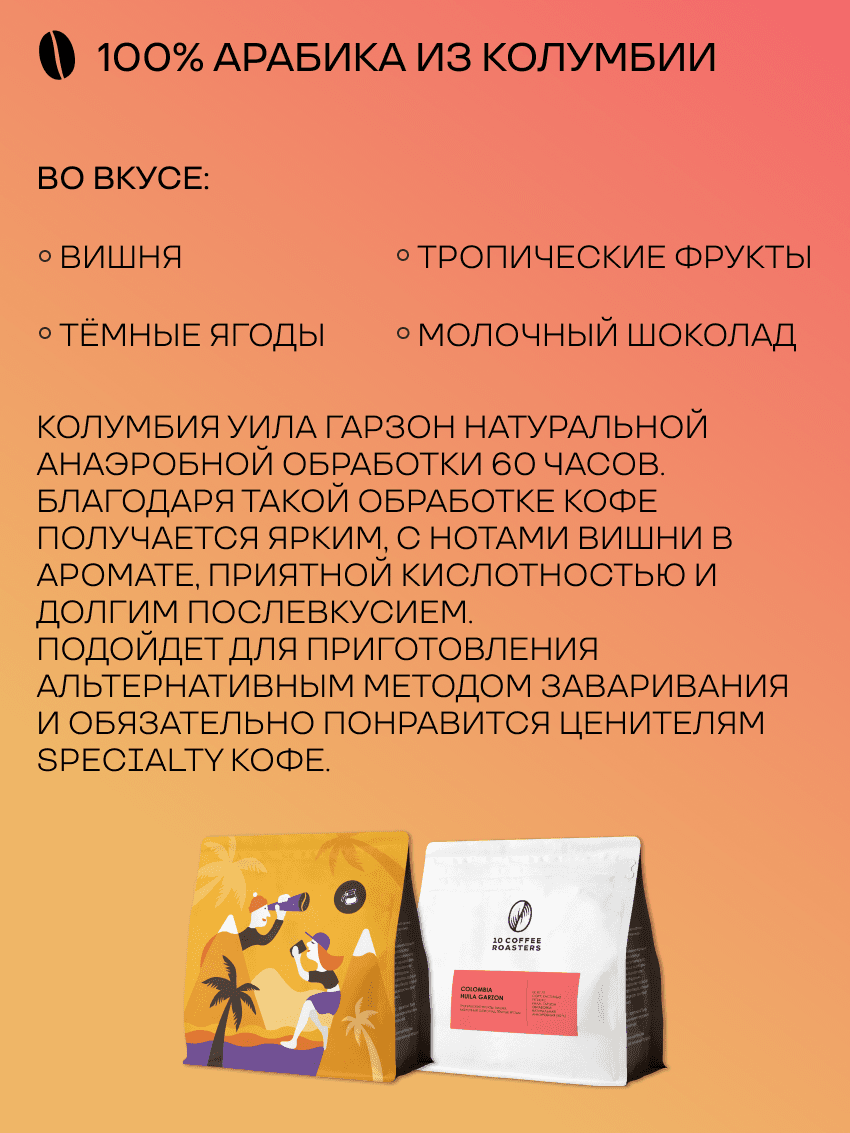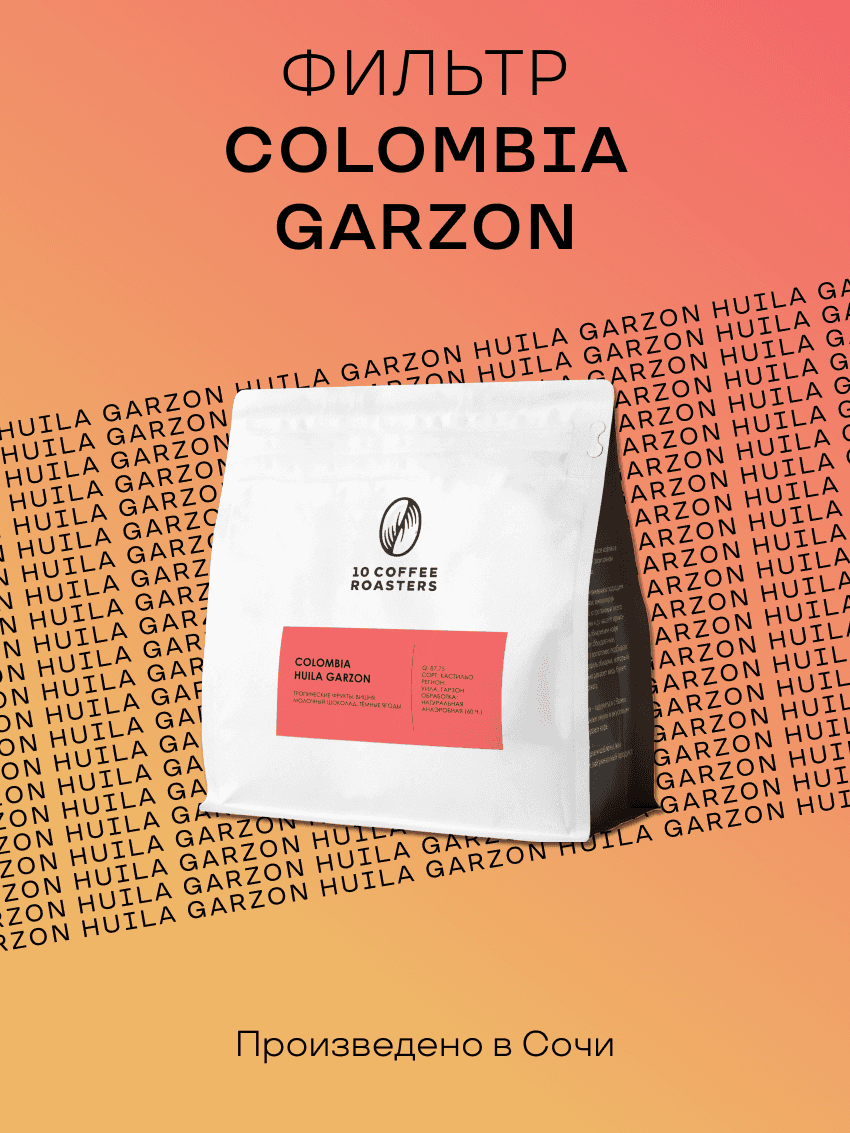 Кофе в зернах Colombia Huila Garzon - кофе для альтернативного метода заваривания. Он подходит для приготовления в фильтр-кофе, воронкой, кемексом, аэропрессом и др. альтернативными методами - всё ограничивается вашими предпочтениями. Во вкусе Colombia Huila Garzon - тропические фрукты, вишня , молочный шоколад, тёмные ягоды. Сладкий, сбалансированный вкус и низкая горечь. Благодаря светлой обжарке кофе получается с ярким и насыщенным. Он отлично подойдёт ценителям фильтр-кофе. Благодаря свежести обжарки, герметичности дой-пак упаковки с обратным клапаном, который выпускает излишек углекислого газа и предохраняет зерна от воздействия кислорода, вы получаете кофе первой свежести с ярким, насыщенным вкусом. Рекомендации по хранению и употреблению: Для достижения наилучших результатов, храните кофе в сухом и прохладном месте, подальше от прямых солнечных лучей. Рекомендуем использовать свежемолотые зерна и готовить кофе непосредственно перед употреблением, чтобы ощутить всю глубину его вкуса Характеристики: Оценка Q: 87.75 Сорт: Кастильо Обработка: натуральная, анаэробная 60 ч. Регион: Уила, Гарзон Урожай: Актуальный Обжарка: Светлая Классический вариант для вашего фильтр-кофе в кафе или дома. 10Coffee – небольшое кофейное производство в самом южном регионе России. Мы с особым вниманием подходим к выбору сырья, контролируя его качество на протяжении всего пути от фермы и до нашего производства. Мы обжариваем кофе на новейшем оборудовании, тщательно и кропотливо подбирая лучший профиль обжарки, который максимально раскроет весь букет вкуса и аромата. Наша цель – поделиться с Вами удивительным миром и вкусовым многообразием кофе. Мы не делаем шаблоны, мы создаем свой уникальный продукт. Условия хранения Хранить в тёмном, сухом помещении без доступа прямых солнечных лучей. Состав арабика
