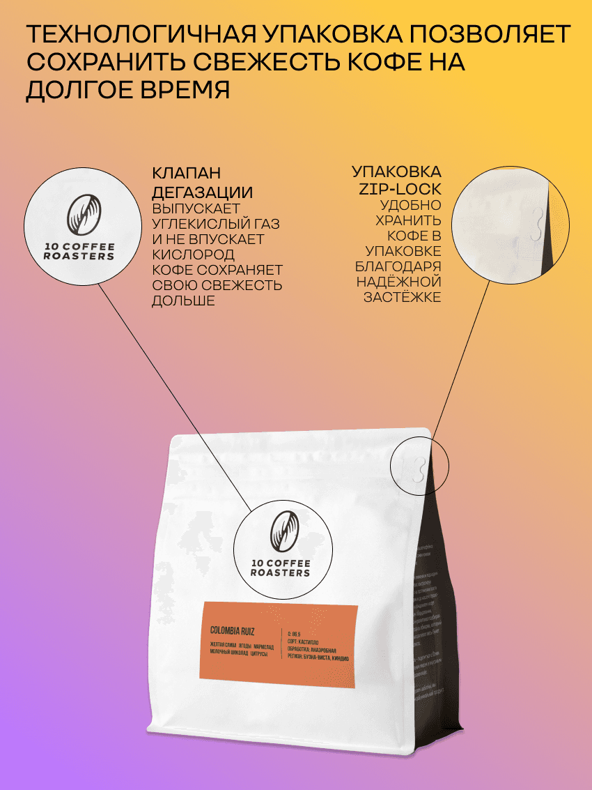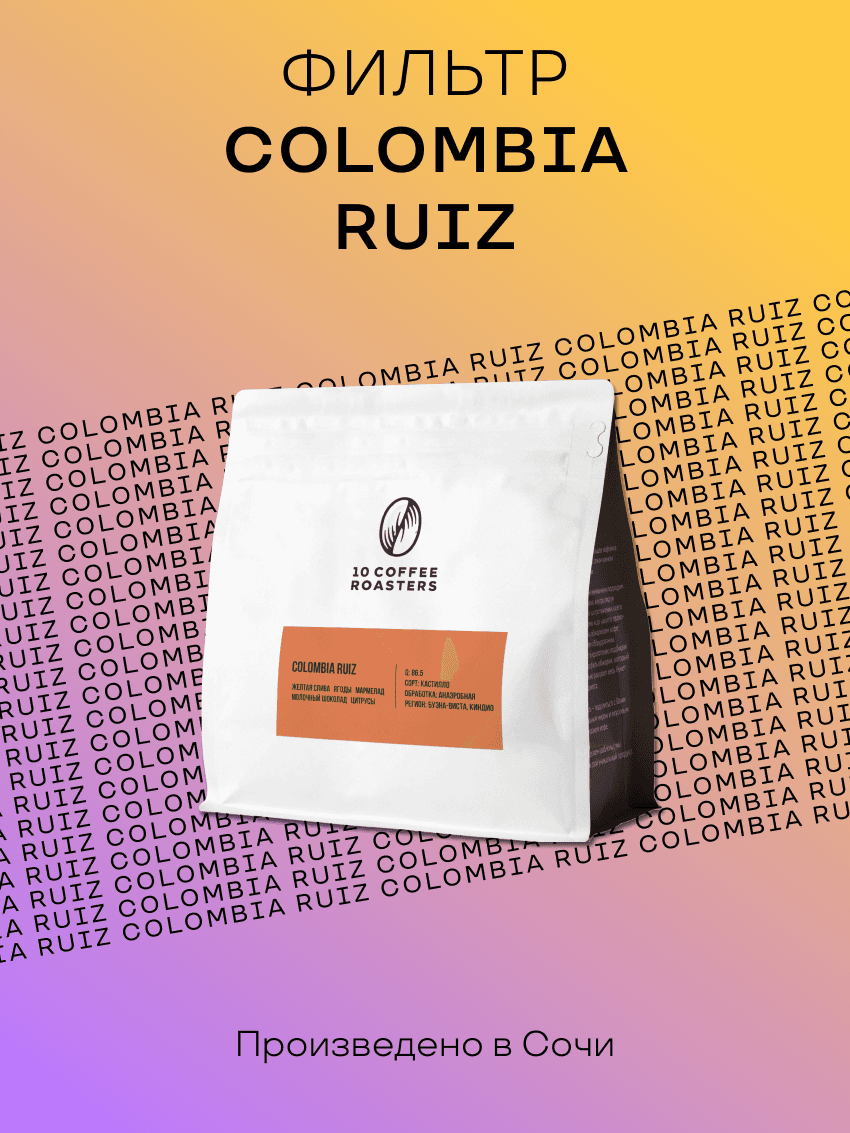 Кофе в зернах Colombia Ruiz - кофе для альтернативного метода заваривания. Он подходит для приготовления в фильтр-кофе, воронкой, кемексом, аэропрессом и др. альтернативными методами - всё ограничивается вашими предпочтениями. Во вкусе Colombia Ruiz - жёлтая слива, ягоды, мармелад, молочный шоколад, цитрусы. Сладкий, сбалансированный вкус и низкая горечь. Благодаря светлой обжарке кофе получается с ярким и насыщенным. Он отлично подойдёт ценителям фильтр-кофе. Благодаря свежести обжарки, герметичности дой-пак упаковки с обратным клапаном, который выпускает излишек углекислого газа и предохраняет зерна от воздействия кислорода, вы получаете кофе первой свежести с ярким, насыщенным вкусом. Рекомендации по хранению и употреблению: Для достижения наилучших результатов, храните кофе в сухом и прохладном месте, подальше от прямых солнечных лучей. Рекомендуем использовать свежемолотые зерна и готовить кофе непосредственно перед употреблением, чтобы ощутить всю глубину его вкуса. Характеристики: Оценка Q: 86.5 Сорт: Кастилло Обработка: натуральная, анаэробная Регион: Буэна-Виста, Киндио Урожай: Актуальный Обжарка: Светлая Классический вариант для вашего фильтр-кофе в кафе или дома. 10Coffee – небольшое кофейное производство в самом южном регионе России. Мы с особым вниманием подходим к выбору сырья, контролируя его качество на протяжении всего пути от фермы и до нашего производства. Мы обжариваем кофе на новейшем оборудовании, тщательно и кропотливо подбирая лучший профиль обжарки, который максимально раскроет весь букет вкуса и аромата. Наша цель – поделиться с Вами удивительным миром и вкусовым многообразием кофе. Мы не делаем шаблоны, мы создаем свой уникальный продукт. Условия хранения в сухом месте без доступа к прямым солнечным лучам Состав арабика