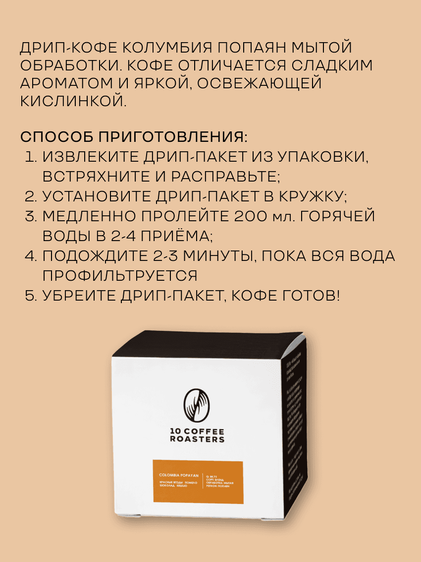 Познакомьтесь с ярким и самобытным вкусом арабики из Руанды, которая выращивается в регионе Мараба на плато вокруг города Бутаре. Этот кофе культивируется на высотах от 1700 до 2000 метров над уровнем моря на плодородных вулканических почвах, что наделяет его исключительной сложностью и глубиной. Кофе Rwanda Maraba обладает богатым ароматом с цветочными и фруктовыми нотами, а его вкус характеризуется приятной винно-ягодной кислинкой и долгим сладким послевкусием. Этот сорт высоко ценится гурманами за сбалансированный и запоминающийся букет. Идеален для простого и быстрого приготовления в дрип-пакете. Просто установите пакет на кружку, медленно залейте 200 мл горячей воды и через 2–3 минуты наслаждайтесь готовым напитком без лишних хлопот. Способ приготовления: 1. Извлеките дрип-пакет из упаковки, встряхните и расправьте его. 2. Установите дрип-пакет на кружку. 3. Медленно залейте 200 мл горячей воды в 2–4 приема. 4. Подождите 2–3 минуты, пока вся вода профильтруется. 5. Уберите дрип-пакет. Ваш кофе готов!! Условия хранения Хранить в сухом, прохладном месте при температуре не выше +25С и относительной влажности воздуха не более 75%. Состав 100% арабика