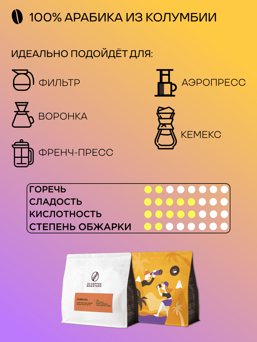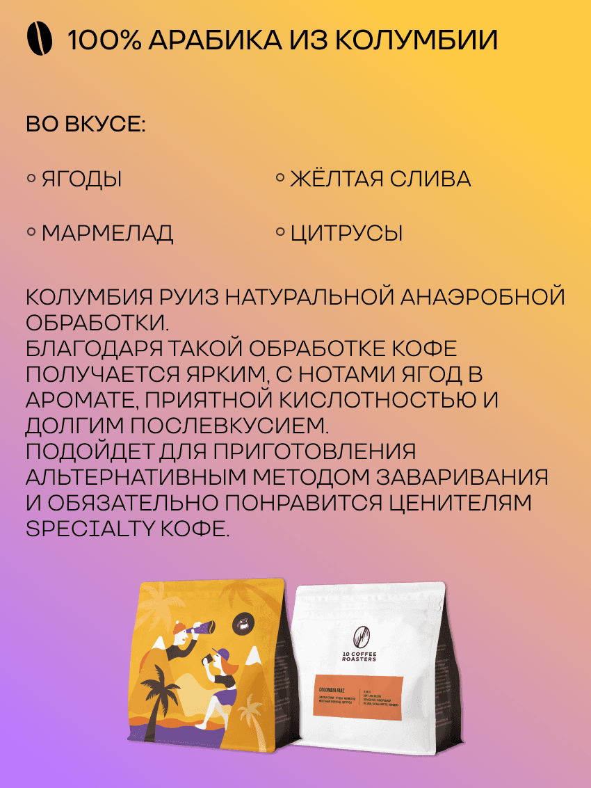 Кофе в зернах Colombia Ruiz - кофе для альтернативного метода заваривания. Он подходит для приготовления в фильтр-кофе, воронкой, кемексом, аэропрессом и др. альтернативными методами - всё ограничивается вашими предпочтениями. Во вкусе Colombia Ruiz - жёлтая слива, ягоды, мармелад, молочный шоколад, цитрусы. Сладкий, сбалансированный вкус и низкая горечь. Благодаря светлой обжарке кофе получается с ярким и насыщенным. Он отлично подойдёт ценителям фильтр-кофе. Благодаря свежести обжарки, герметичности дой-пак упаковки с обратным клапаном, который выпускает излишек углекислого газа и предохраняет зерна от воздействия кислорода, вы получаете кофе первой свежести с ярким, насыщенным вкусом. Рекомендации по хранению и употреблению: Для достижения наилучших результатов, храните кофе в сухом и прохладном месте, подальше от прямых солнечных лучей. Рекомендуем использовать свежемолотые зерна и готовить кофе непосредственно перед употреблением, чтобы ощутить всю глубину его вкуса. Характеристики: Оценка Q: 86.5 Сорт: Кастилло Обработка: натуральная, анаэробная Регион: Буэна-Виста, Киндио Урожай: Актуальный Обжарка: Светлая Классический вариант для вашего фильтр-кофе в кафе или дома. 10Coffee – небольшое кофейное производство в самом южном регионе России. Мы с особым вниманием подходим к выбору сырья, контролируя его качество на протяжении всего пути от фермы и до нашего производства. Мы обжариваем кофе на новейшем оборудовании, тщательно и кропотливо подбирая лучший профиль обжарки, который максимально раскроет весь букет вкуса и аромата. Наша цель – поделиться с Вами удивительным миром и вкусовым многообразием кофе. Мы не делаем шаблоны, мы создаем свой уникальный продукт. Условия хранения в сухом месте без доступа к прямым солнечным лучам Состав арабика